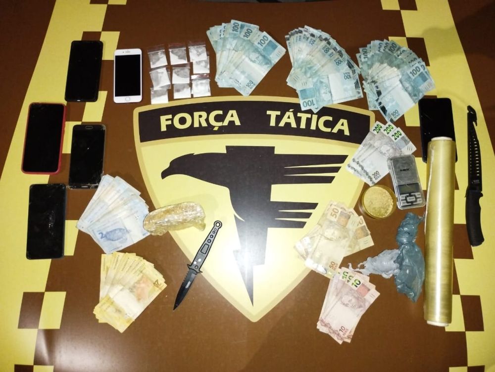 Em duas ocorrências distintas, os policiais militares apreenderam porções de substâncias análogas à cocaína e ao crack, celulares, e dinheiro proveniente da venda das drogas.