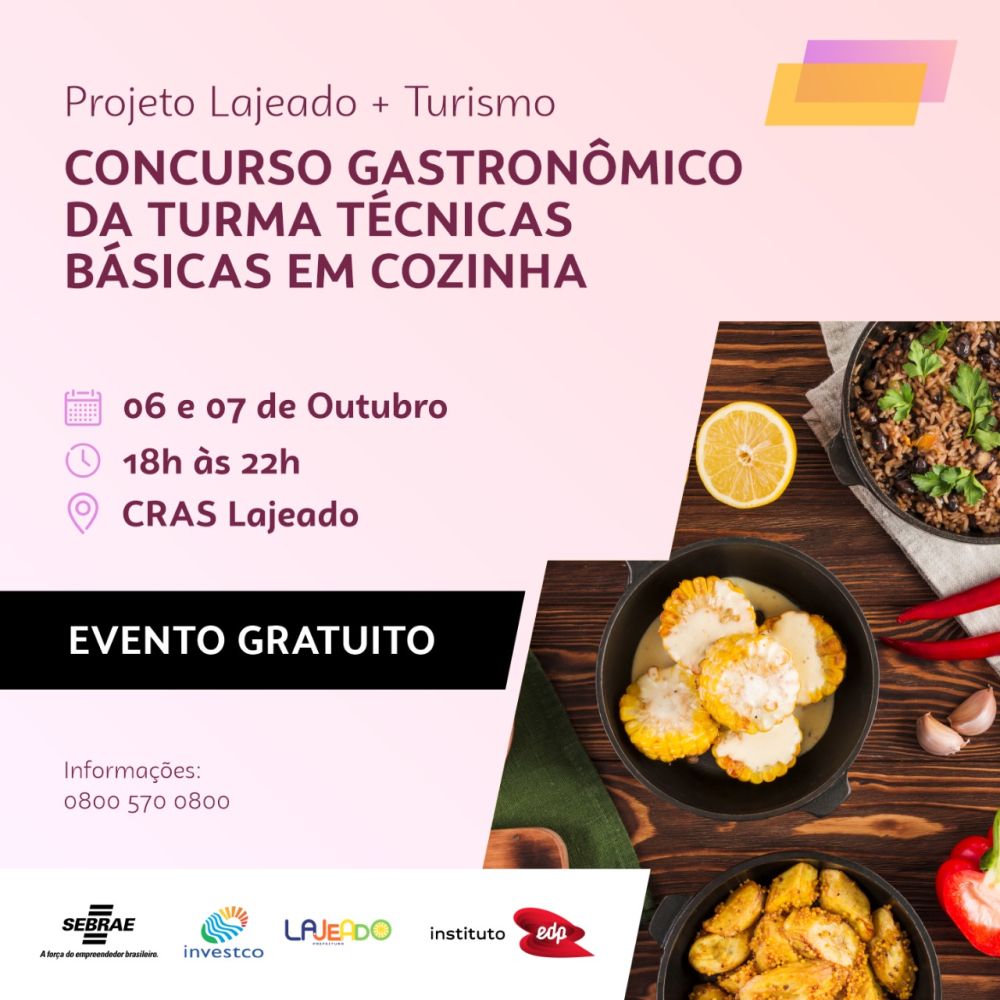 Com o objetivo de valorizar os participantes do curso de Técnica Básica em Cozinha, o Sebrae Tocantins, por meio do projeto Lajeado + Turismo, realiza entre os dias 06 e 07 de outubro um Concurso Gastronômico em Lajeado. O evento busca fomentar a competitividade dos pequenos negócios do ramo atuantes no município de Lajeado. A competição ocorrerá no Centro de Referência de Assistência Social (Cras) do município a partir das 18h30.